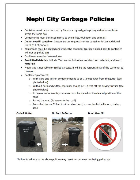 The Solid Waste Department collects over 2,000 garbage cans per week. Currently, the Streets Department has one collection truck and a driver. The monumental task of collecting from residential and business areas for Nephi City is completed each week over three business days. We are dedicated to giving you the service you need and deserve!